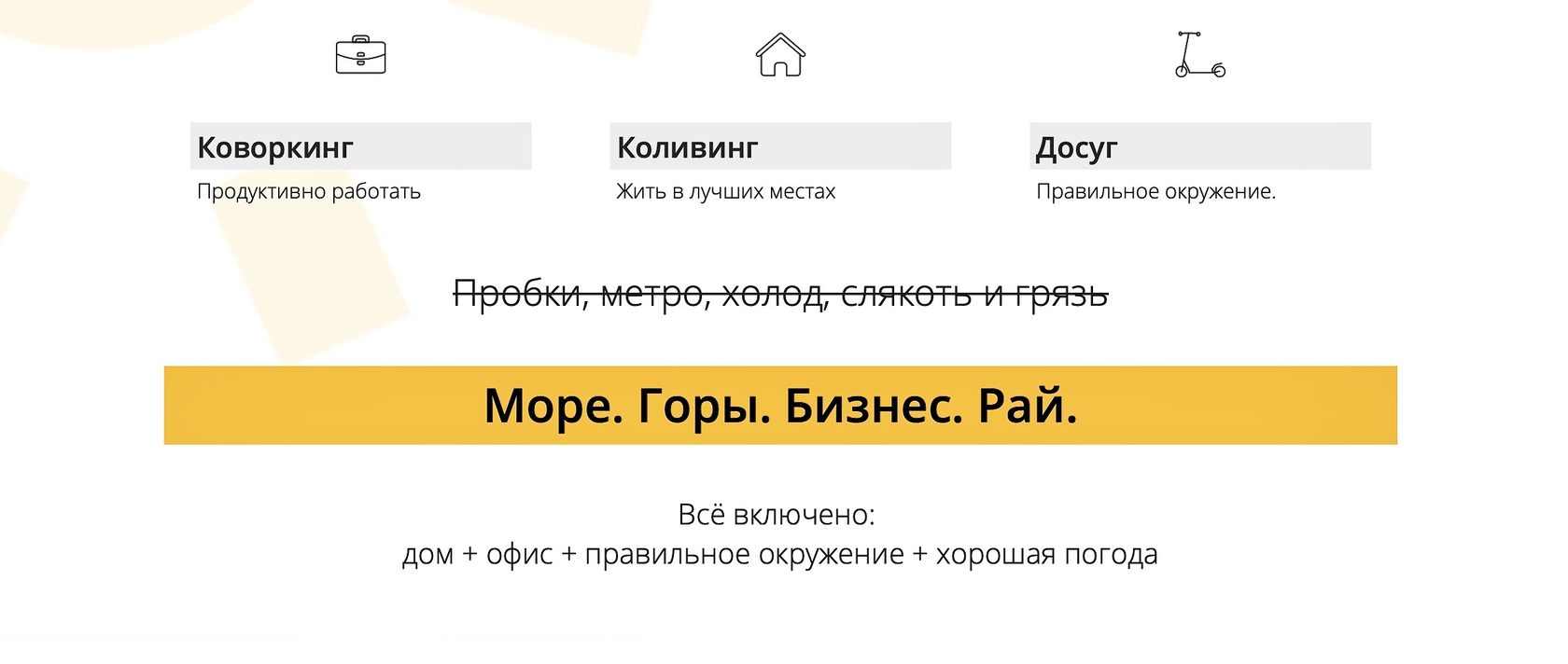Вот таким нехитрым выбором манит страничка нашего черноморского пристанища, предлагающего «цифровым кочевникам» отдохнуть, пожить и поработать вместе. Здесь, как и в резиновой нынче Турции, было включено практически всё: хорошая погода, правильное окружение, коливинг и коворкинг.